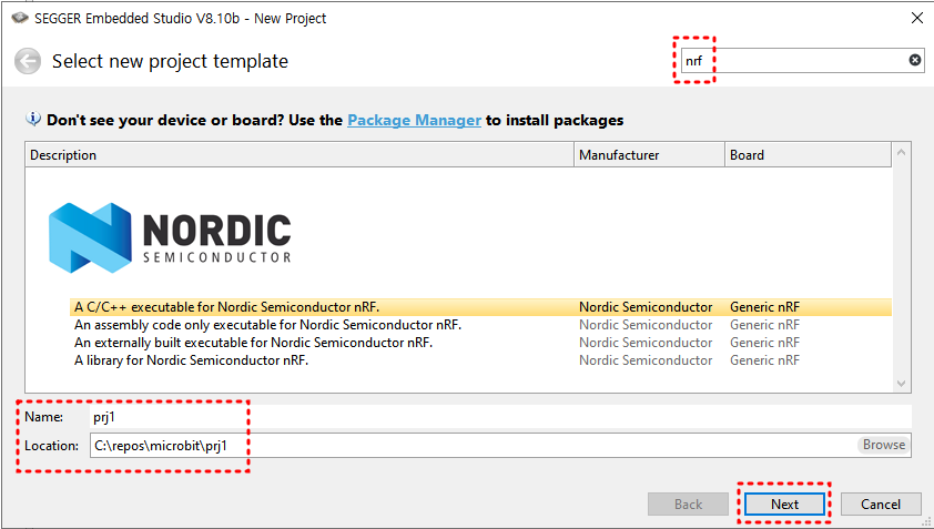 이후 아래와 같이 우측 상단에서 nrf로 검색하면 NORDIC package를 볼 수 있습니다. prj1으로 신규 생성해 보았습니다.