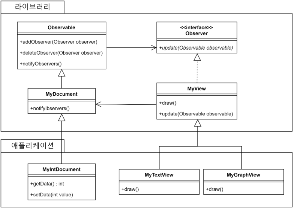 객체들간 의존성을 최소화 하면서 여러 객체에 이벤트 전달, 구독자는 동적 증가/감소 가능, 상태가 변경되면 다른 객체들한테 연락 (상위 레이어로 callback 또는 listener에 사용: 역방향) 우측 그림에서 MyTextView(Observer)는 MyIntDocument(Subject)에 정보가 갱신되면 연락을 받는다. MyIntDocument::addObserver(MyTextView) 하면 내부적으로 MyView::update(Observable)가 호출됨. https://syseng.tistory.com/213 (1:N) Pub/Sub 패턴과 유사한 듯 하지만 차이점 : Observer는 Broker가 없음. Broker로 인해 Pub/Sub에서는 양쪽 모두 의존성이 없음. Observer는 동기, Pub/Sub은 비동기 |