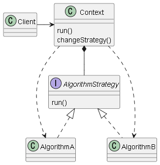 | Strategy | 여러 상황에 따라 구현이나 알고리즘을 변경하여 사용할 수 있도록 (동적 변경도 가능) 우측 그림에서 Context는 각 Strategy들을 교체하여 사용, Client에서 AlgorithmA/B에 대한 의존성을 Context로 이동 |