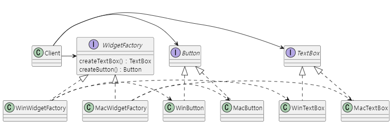 | Abstract Factory | 여러 객체를 의존적으로 다르게 생성하고자 할때 우측 그림에서 Client는 WinWidgetFactory와 MacWidgetFactory만 알고 있고 각 Botton과 TextBox는 WidgetFactory가 알아서 생성함 Botton과 TextBox 생성 의존성을 WidgetFactory를 상속하는 객체로 이동 |